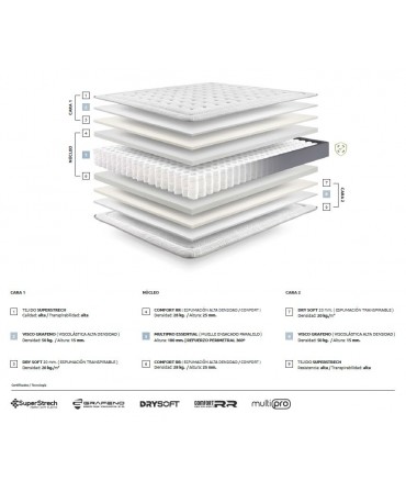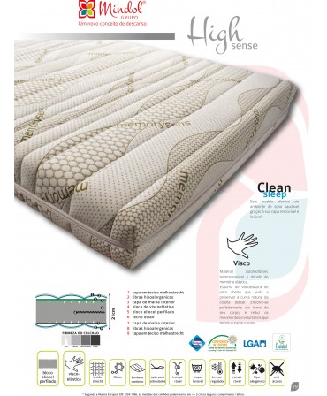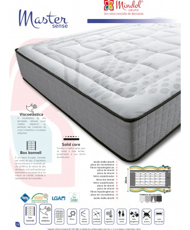 Combinação de viscoelástica, box bonnel e Solid core, tendo como compromisso uma firmeza média e o conforto, sem esquecer o design atual.