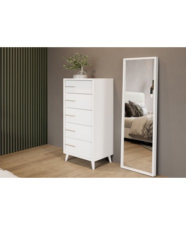 Estrutura em madeira maciça de tília com acabamento lacado branco mate e talha.