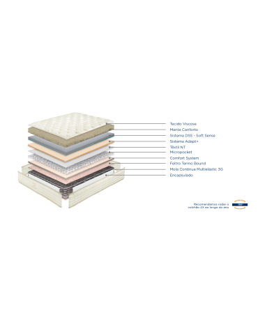 Mola Contínua Multielástic 3G - A 3ª geração da mola contínua Multielástic possui uma estrutura mais robusta e consistente. Formada por molas com duas espessuras diferentes de arame e resistência e com reforços laterais que permitem dispor de firmezas distintas.