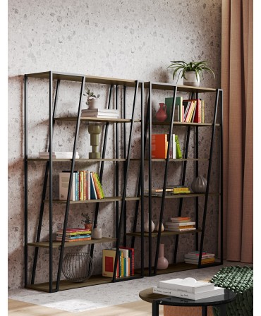 Materiais: Laterais metálicos lacados epóxi em preto ou branco. Prateleiras em painéis de aglomerado de madeira nomeadamente à base de madeira reciclada, folheados a madeira natural.