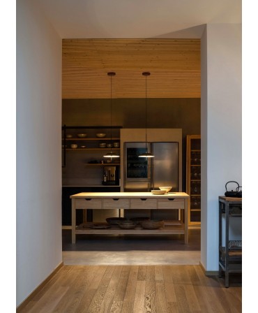 O candeeiro é uma releitura dos candeeiros suspensos tradicionalmente usados ​​sobre as mesas de bilhar. Uma abordagem inovadora e fresca para a iluminação.