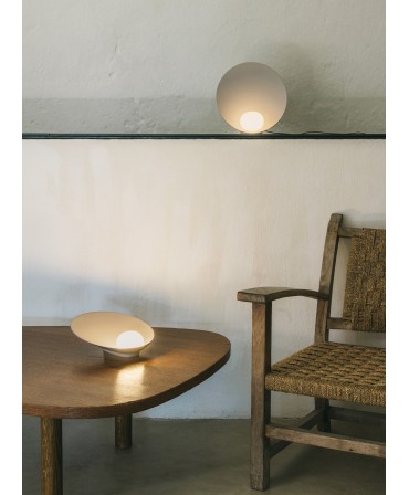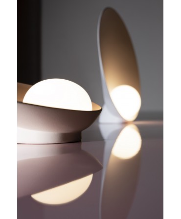 Criada pelo Note Design Studio, Musa é uma lâmpada de qualidades orgânicas que atrai o olhar devido à sua função de iluminação. Um design delicado e elegante onde se estabelece uma interação simbiótica entre a pequena esfera de vidro opalino soprado à mão e o prato que a contém e reflete. Concebido como candeeiro de mesa. A sua capacidade de trabalhar em qualquer lugar sublinha a sua forma física poética.