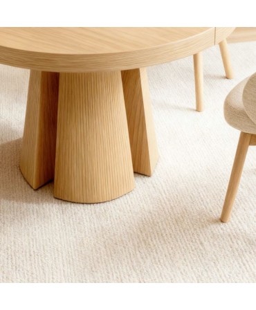 A mesa Marcela é uma joia do design contemporâneo que combina aconchego, funcionalidade e uma silhueta marcante. Fabricada em folheado de carvalho natural, a sua superfície redonda de 120 cm, extensível até 170 cm, desdobra-se fluidamente a partir do centro para se adaptar a encontros íntimos ou reuniões maiores, tornando-a uma peça tão versátil quanto elegante.