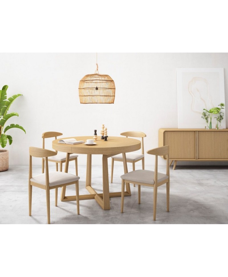 Mesa redonda extensível com pés e tampo em madeira.