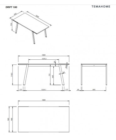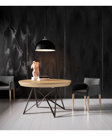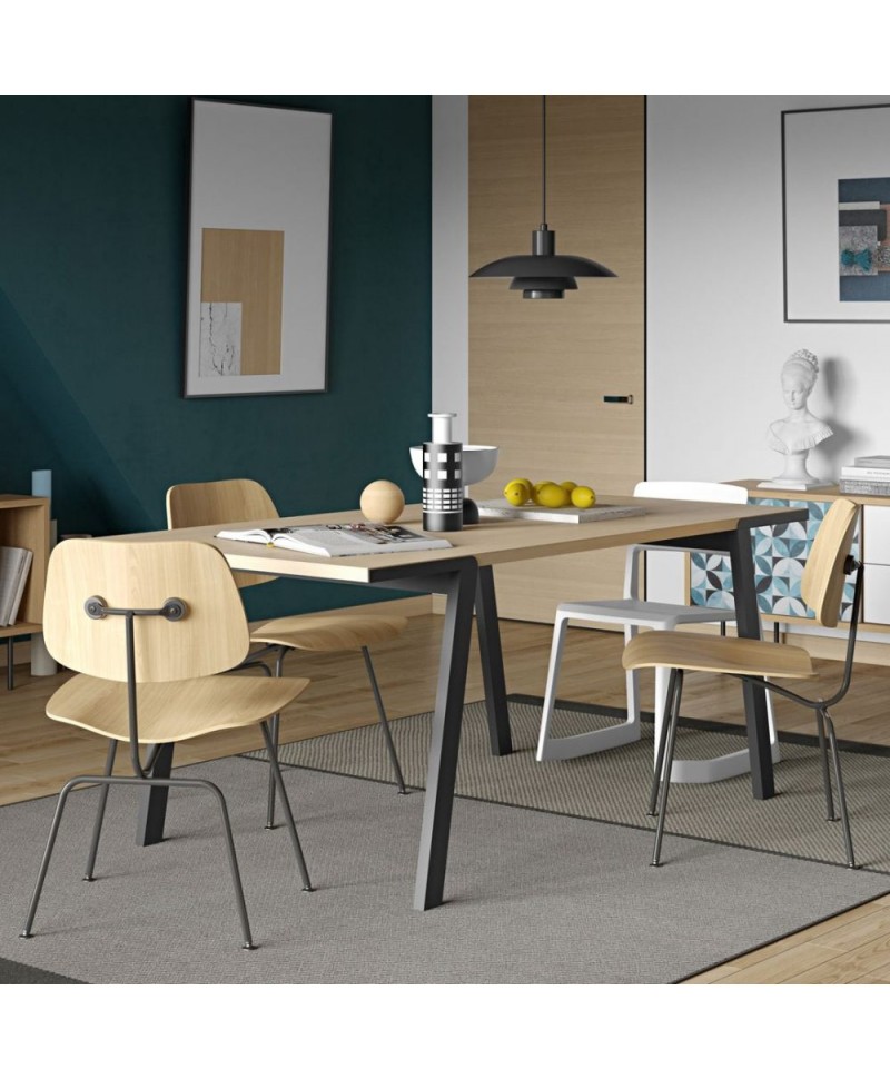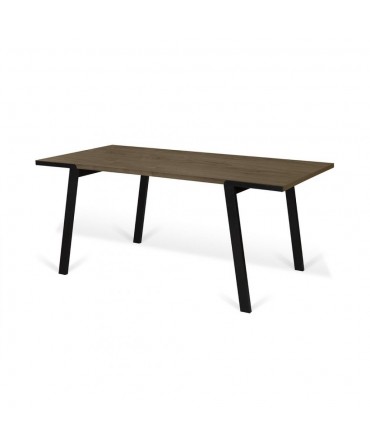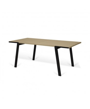 Mesa de refeições minimalista com tampo em carvalho ou nogueira e pés metálicos pretos