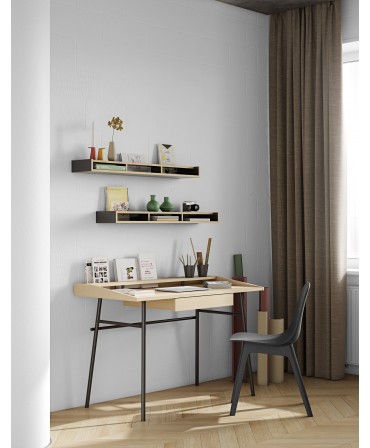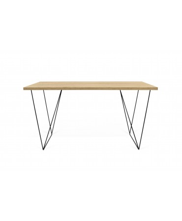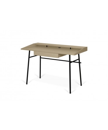 Secretária em madeira e metal preto.